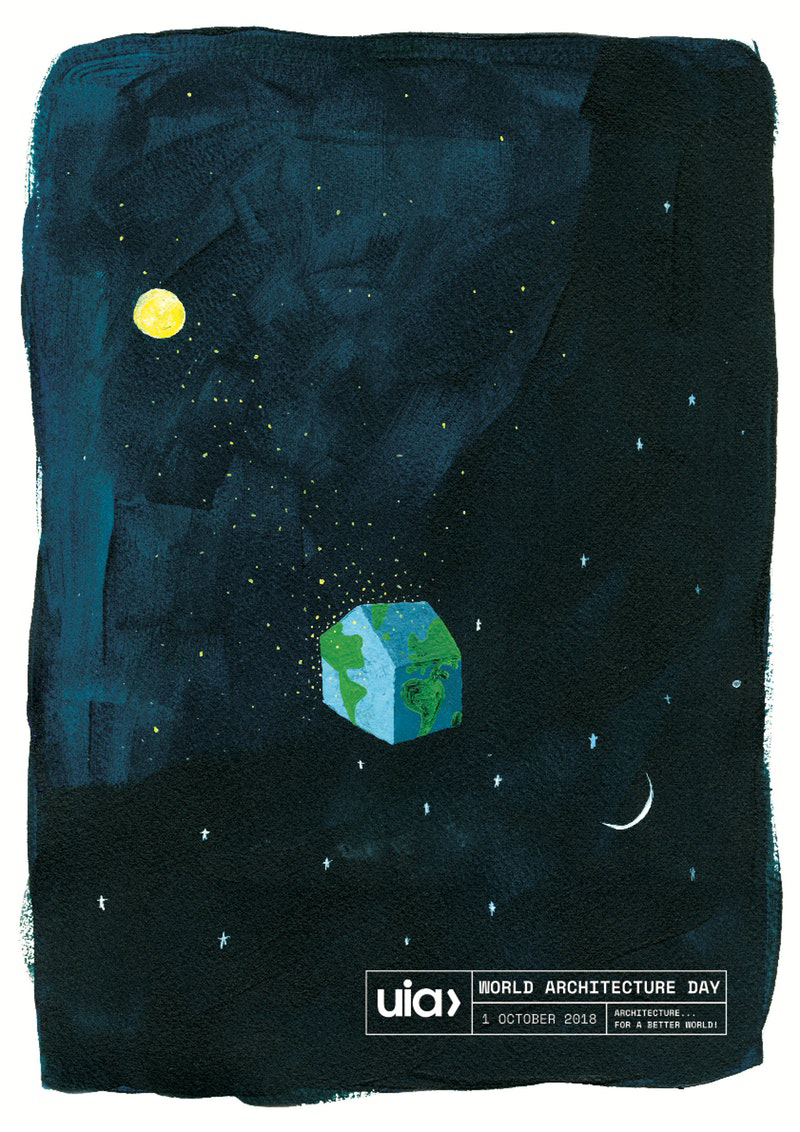 The UIA marks World Architecture Day on the first Monday of every October, to celebrate the power and value of architecture. It is an occasion for our member sections throughout the world to stage events and actions that advance architecture in the public eye. This year, for the first time, the UIA held an international competition for design of the 2018World Architecture Day poster. We received hundreds of entries, from which a distinguished jury of graphic designers chose the winner, attached, by Ana Rute Costa and Rúben Ferreira Duarte of Portugal.