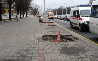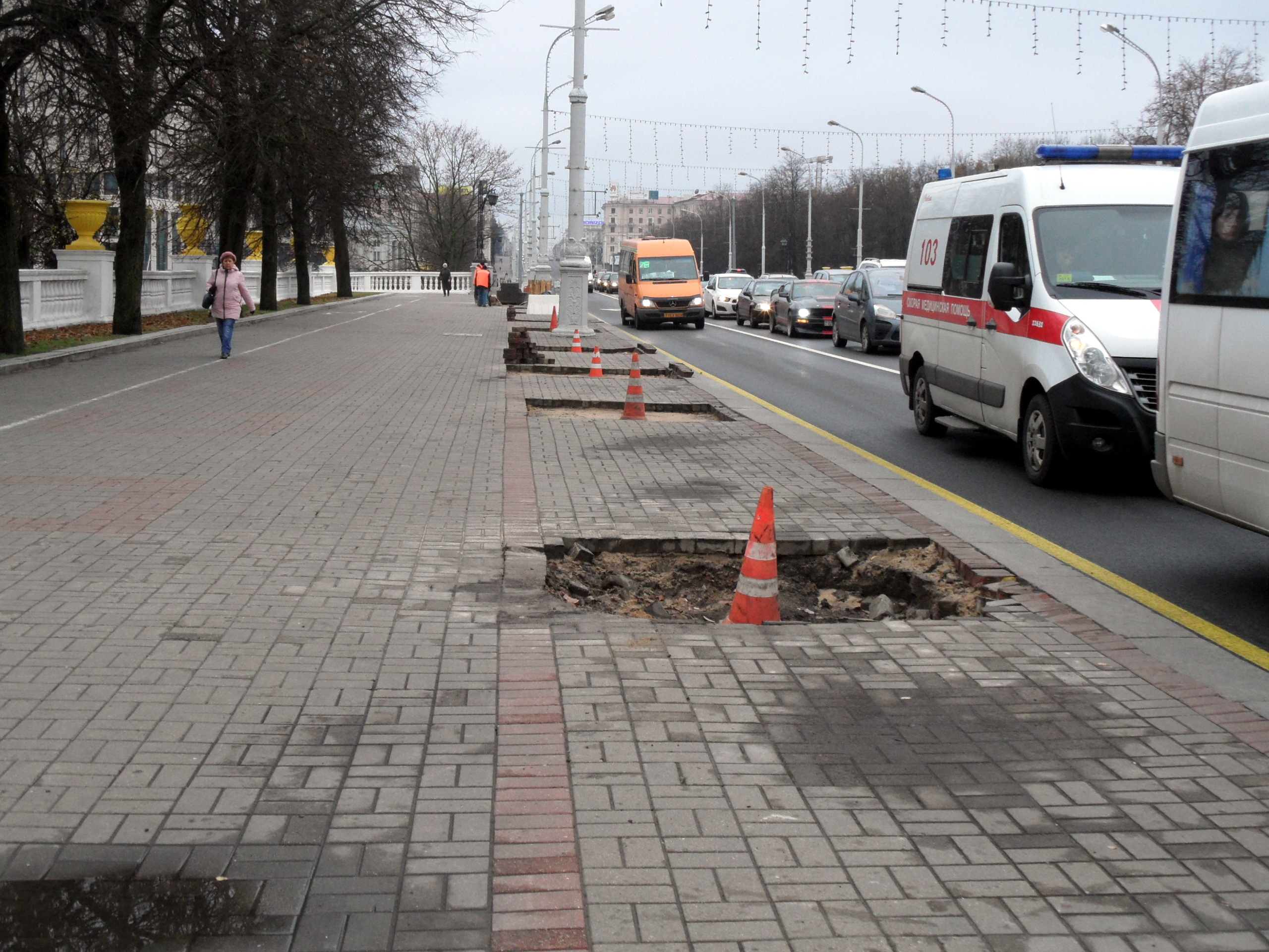 Вчера, проходя по проспекту Независимости заметил, что на участке от ул. Янки Купалы до площади Победы убрали последние липы из двух рядов, примыкающих к проезжей части проспекта. Лунки заделывали заплатками из бетонной плитки.