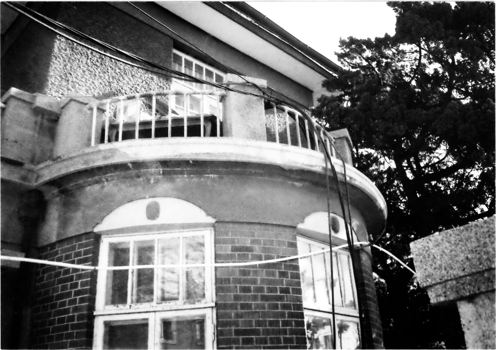 Внешний облик дома соответствовал архитектурным особенностям плана, и структура здания «прочитывалась» свободно. Главные помещения основного объема (был еще хозяйственный блок с гаражом) были выстроены цепочкой, раскрываясь окнами и балконами в сад. Анфилада залов 1-го этажа замыкалась на западном торце здания экседрой – глубокой полукруглой нишей (даже со специально изготовленным для нее традиционным диваном), выявленной на фасаде полуцилиндрическим выступом. Поперечная ось цепочки основных помещений подчеркивалась с одной стороны здания большим витражным окном двусветного холла с внутренней 3-маршевой деревянной лестницей, с другой – верандой и балконом над ней на 1-м и 2-м этажах соответственно.