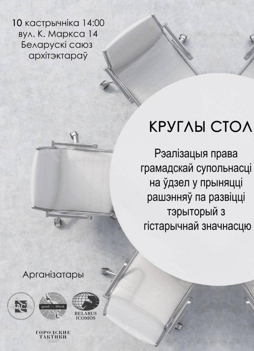 Увага! Для ўдзелу ў мерапрыемстве патрабуецца рэгістрацыя па спасылцы https://goo.gl/FKZWLe. Удзел у круглым стале "Рэалізацыя права грамадскай супольнасці на ўдзел у прыняцці рашэнняў па развіцці тэрыторый з гістарычнай значнасцю" вольны.