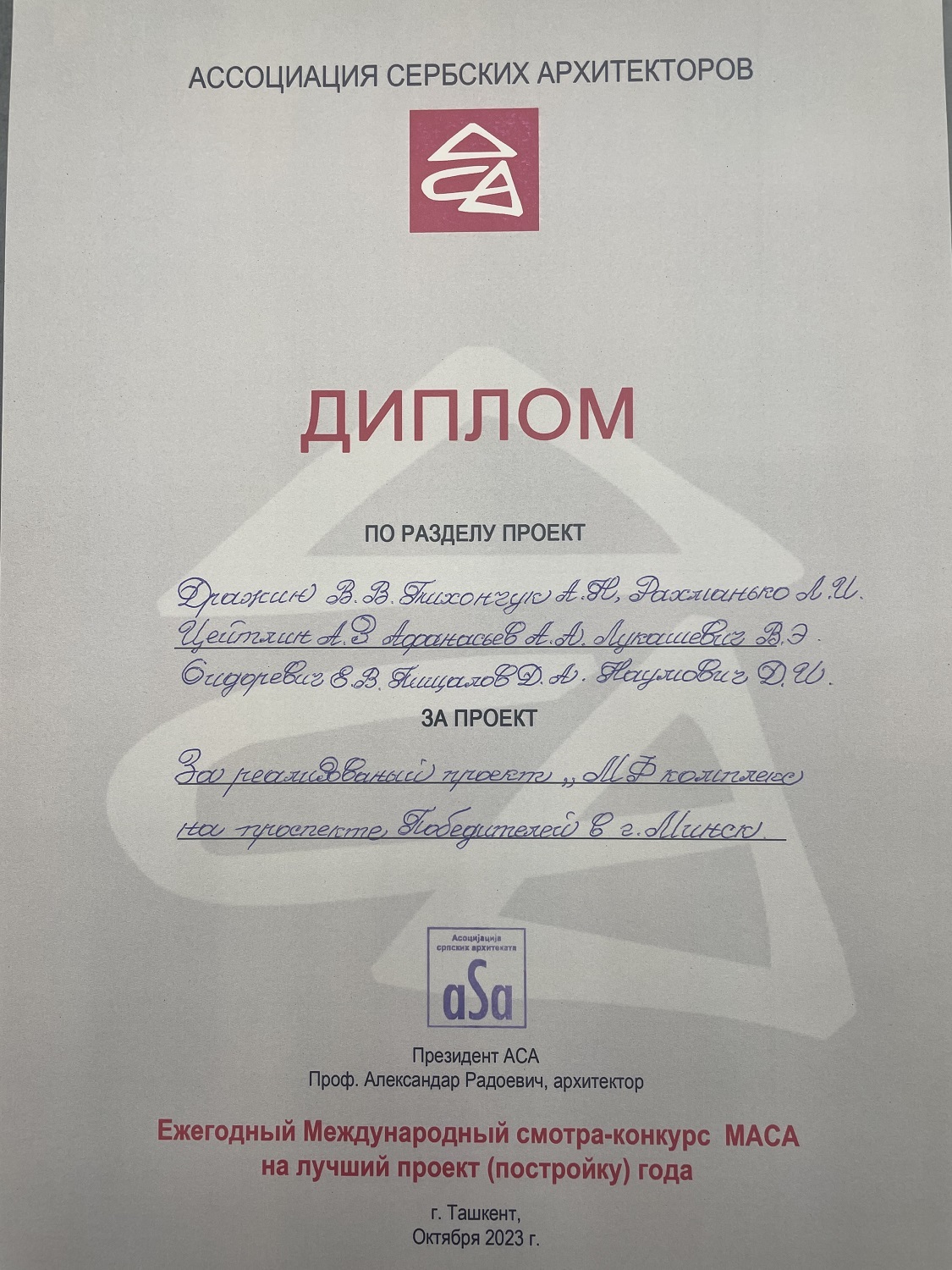 Уже можно поздравить членов делегации В.В. Дражина и А.З. Цейтлина и их коллег с дипломом от СА Сербии за архитектуру нового комплекса по проспекту Победителей в Минске.