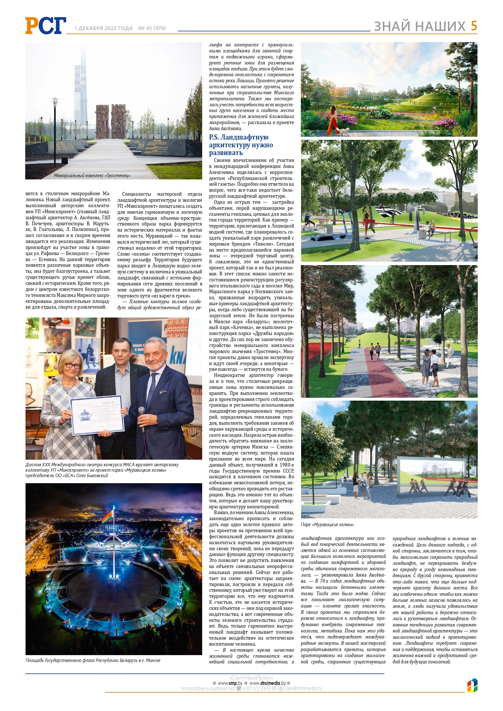 Накануне, 1 - 3 ноября, о достижениях Беларуси в этом жанре зодчества проектах, выполненных творческим коллективом Минскпроекта, докладывали специалисты по ландшафтной архитектуре на XV Международной научной конференции «Формирование комфортной городской среды, устойчивость и идентичность как цели современной ландшафтной архитектуры». Мероприятие проходило в Центре компетенций по вопросам формирования комфортной городской среды г. Санкт-Петербурга и объединило более 40 экспертов из России, Китая, Бразилии, Казахстана, Грузии, Беларуси и других стран. Коллеги обсуждали современные тенденции, экологические векторы проектирования, световой дизайн в объектах ландшафта. В центре внимания — вопросы экологии. В работе форума принимали участие вице-губернатор Санкт-Петербурга Анатолий ПОВЕЛИЙ, председатель Комитета по благоустройству Санкт-Петербурга Василий ПОНИДЕЛКО, заместитель председателя Комитета по благоустройству Лариса КАНУННИКОВА. В качестве ключевого докладчика на конференции от Беларуси выступила главный ландшафтный архитектор отдела ландшафтной архитектуры и экологии УП «Минскпроект», член Союза архитекторов Республики Беларусь, Союза дизайнеров Беларуси, Международной и Европейской федераций ландшафтных архитекторов (IFLA и EFLA) Анна АКСЁНОВА и заместитель декана по учебной работе архитектурного факультета, кандидат архитектуры, доцент Елена НИТИЕВСКАЯ. Участие Анны Алексеевны в форуме неслучайно: именно во многом благодаря ее инициативе достижения ландшафтной архитектуры Беларуси зазвучали в мировом масштабе. (В августе 2021 года на 57-м Всемирном конгрессе Международной федерации ландшафтных архитекторов в Малайзии архитекторы УП «Минскпроект» под руководством Анны Аксёновой, которые трудились над созданием мемориального комплекса «Тростенец» были удостоены призового третьего места. Признание на мировой арене– почетно и ответственно. Белорусский проект «Мемориальный комплекс «Тростенец» прошел отборочный тур, где было представлено более 1000 работ ландшафтных архитекторов со всего мира. Это большой успех всех, кто работал над увековечением памяти узников концлагеря «Тростенец»).