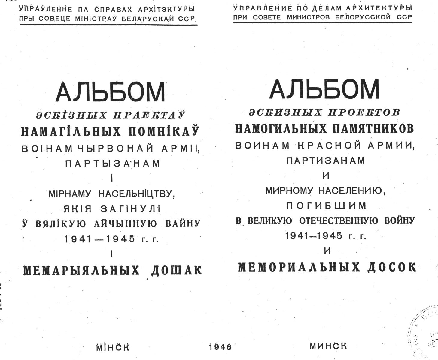 Управлению по делам архитектуры при Совете Министров БССР, а именно отделу охраны памятников архитектуры, которым руководил известный исследователь древнего полоцкого и витебского зодчества И. Хозеров, поручили разработать эскизные проекты намогильных памятников и памятных досок. Отведенный срок был крайне мал – один месяц, и к 15 июня проекты «разослать на места» не получилось. Жюри (архитекторы Н. Вараксин и Т. Страмцова, кандидат искусствоведения М. Кацер) только 6 июля 1946 г. приняло решение по проектам, хотя по некоторым из них высказали советы по доработке. Но и после приказа по управлению [1], вроде бы окончательно утвердившего решение жюри («считать принятыми следующие проекты»), были внесены изменения: добавили работы С. Сперанского, ленинградского архитектора, направленного на восстановление Минска.