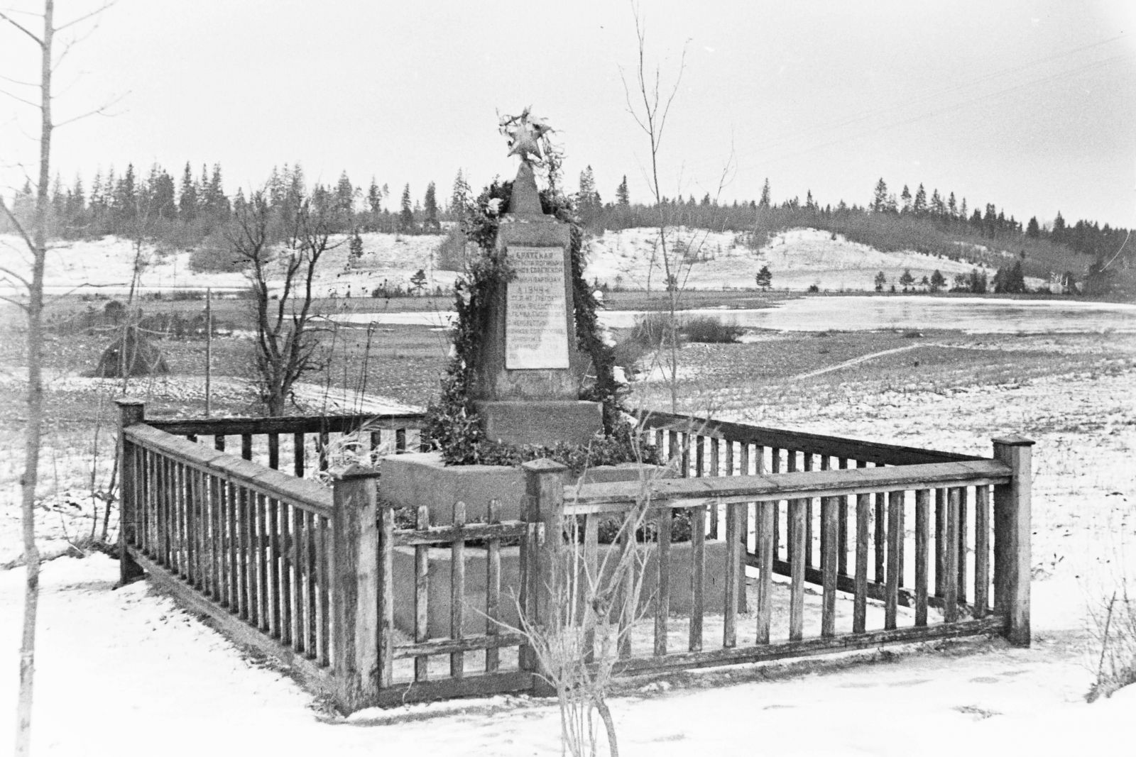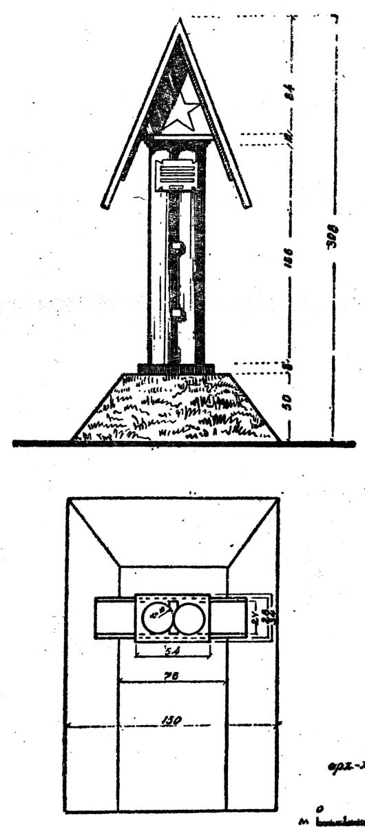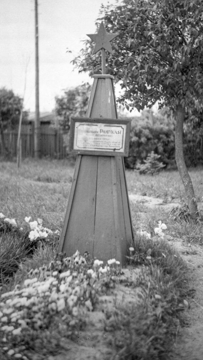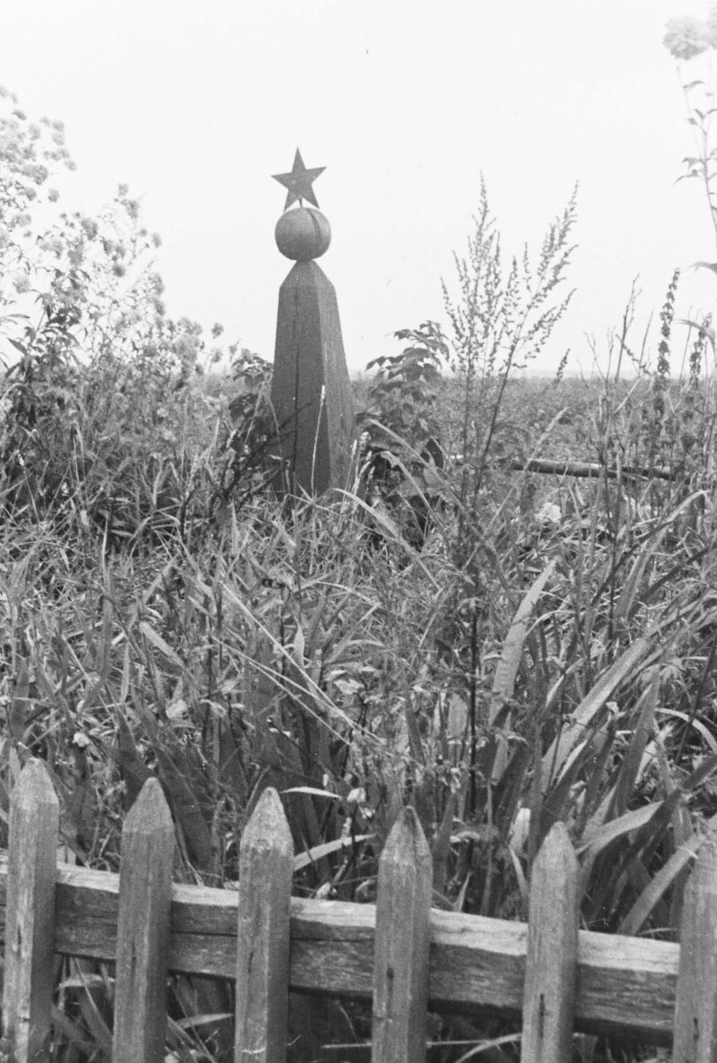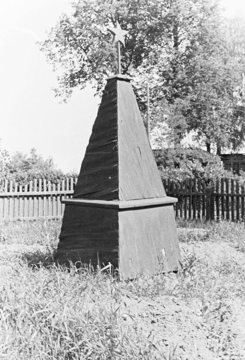 По состоянию на 01.06.1946 г. по 5 областям БССР (Бобруйской, Барановичской, Брестской, Гомельской и Могилевской) было учтено 13 290 индивидуальных могил, по 7 областям (Бобруйской, Барановичской, Брестской, Минской, Витебской, Гомельской и Могилевской) – 4232 братские могилы. Количество благоустроенных индивидуальных и братских могил (обложены дерном, кирпичом, в отдельных случаях огорожены) – 13 826. То есть какой-то порядок был, хотя уровень благоустройства предельно прост. О памятниках речи не шло, лишь упоминался их временный характер, как, например, в случае с памятным знаком около Баранович, поставленным во время войны на могиле генерала И. Рагули (рис. 4).