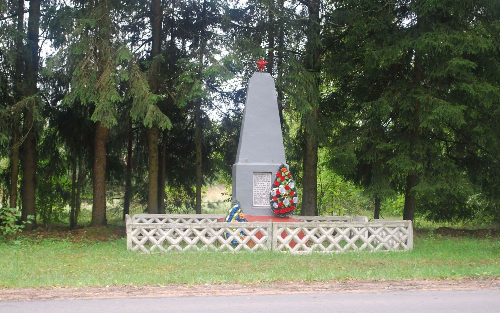 Однако многие из тех первых мемориальных сооружений стоят и сегодня. Возведенные искренне, местными силами и возможностями, с использованием крайне ограниченных материальных и финансовых средств послевоенного времени, они сохранили свои скромные, аскетичные архитектурные формы, выразительно наполненные содержанием глубокого почитания. В парках Гродно стоят памятники павшим воинам и партизанам, установленные в 1947 г. (рис. 15). В бывшем районным центре Козловщина Дятловского района сохранился монумент 1950 г. (рис. 16). На площади поселка городского типа Кривичи Мядельского района возвышается уже упомянутый обелиск 1947 г. – композиционно выверенная монументальная пирамидальная форма. И почти такой же – рядом, в Терешках Вилейского района (рис. 17–18). Недалеко от Глубокого, в урочище Борок, в 1964 г. при реконструкции мемориала на месте гибели советских и иностранных военнопленных нашли возможность включить в новую композицию и прежний обелиск, установленный в начале 1950-х гг.