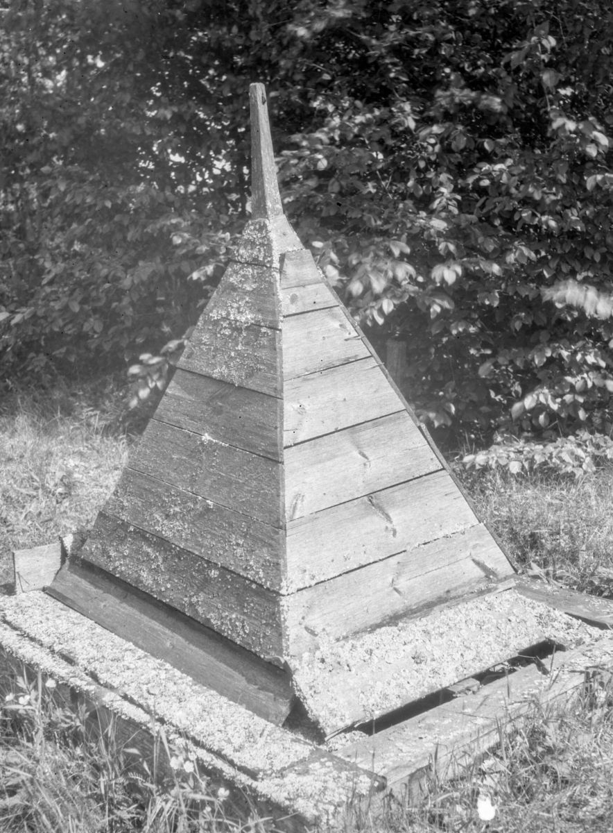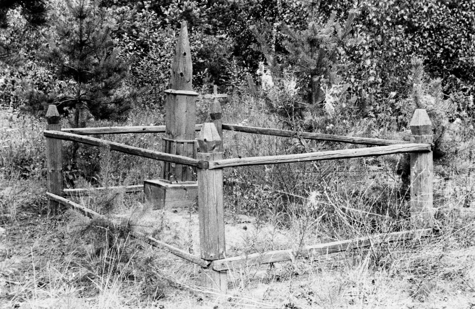 Кроме преобладающей формы памятника в виде столбика применяли в разных вариантах пирамидальную форму, воспроизводившую каменные мемориальные сооружения (рис. 8–9). Дополнением всегда была ограда, устанавливавшая охранный режим территории. Встречались весьма простые ее варианты в виде невысокого штакета. Но чаще элементы ограды украшали: колышки и столбики делали заостренными вверху, а то и замысловато отесанными; вход могли оформить брамой; верх ограды иногда шел не по прямой линии, а по волнистой, и др.