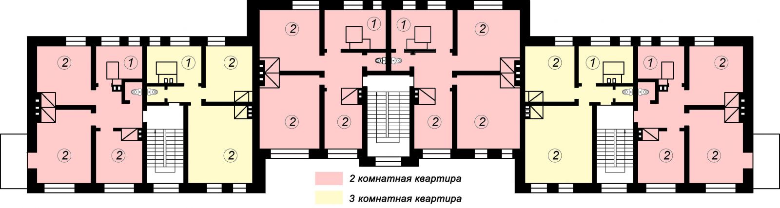 Рис. 7. а) 3-секционный дом рабочего поселка им. Кирова, г. Могилев, Беларусь (из открытых интернет-источников); б) план типового этажа. |