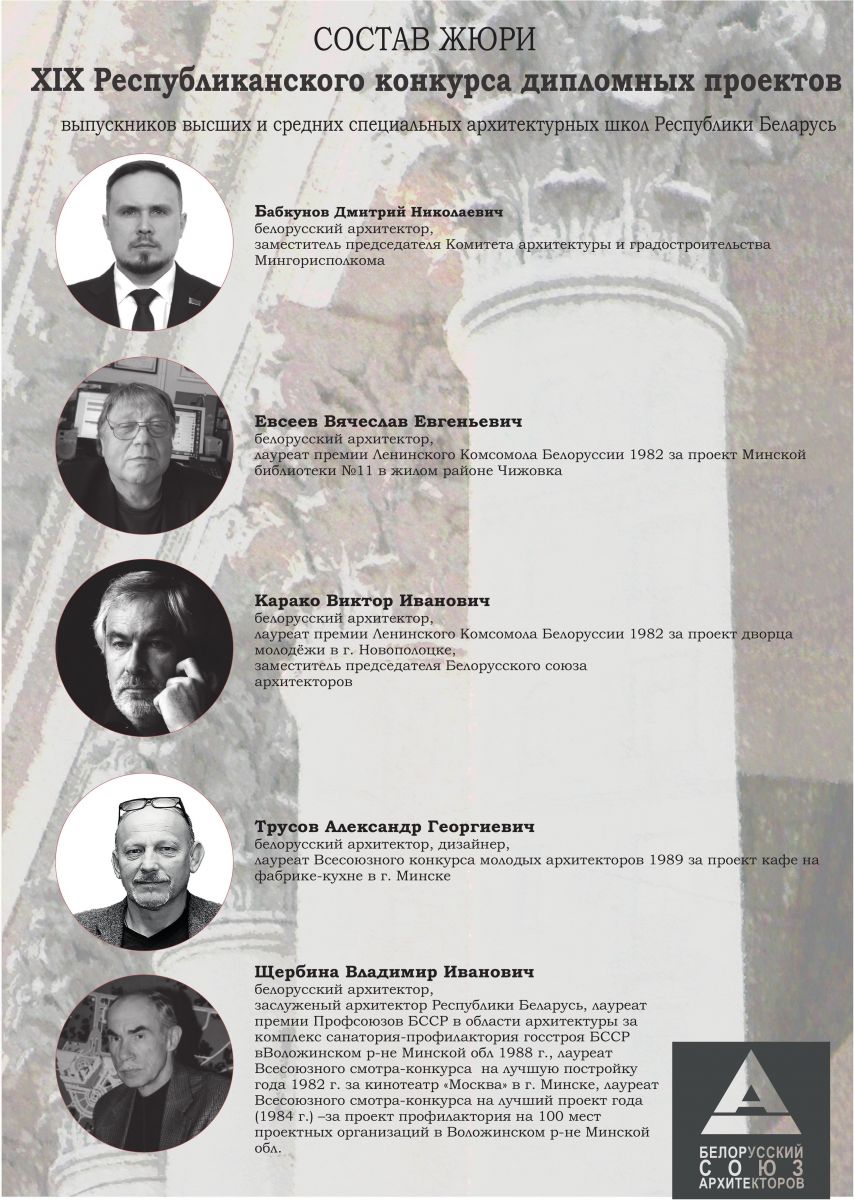 Состав уважаемого жюри XIX Республиканского конкурса дипломных проектов выпускников высших и средних специальных архитектурных школ Республики Беларусь.