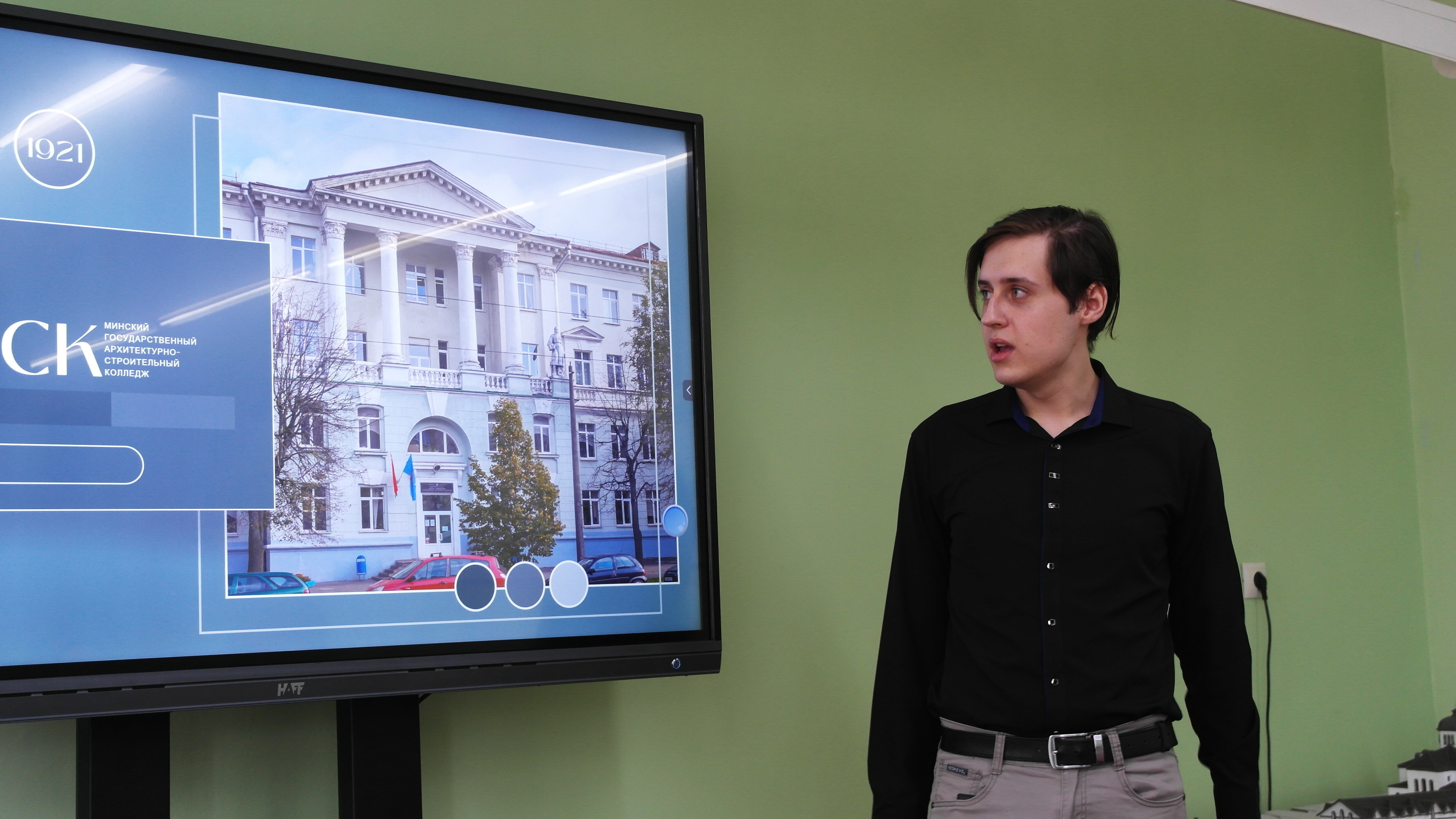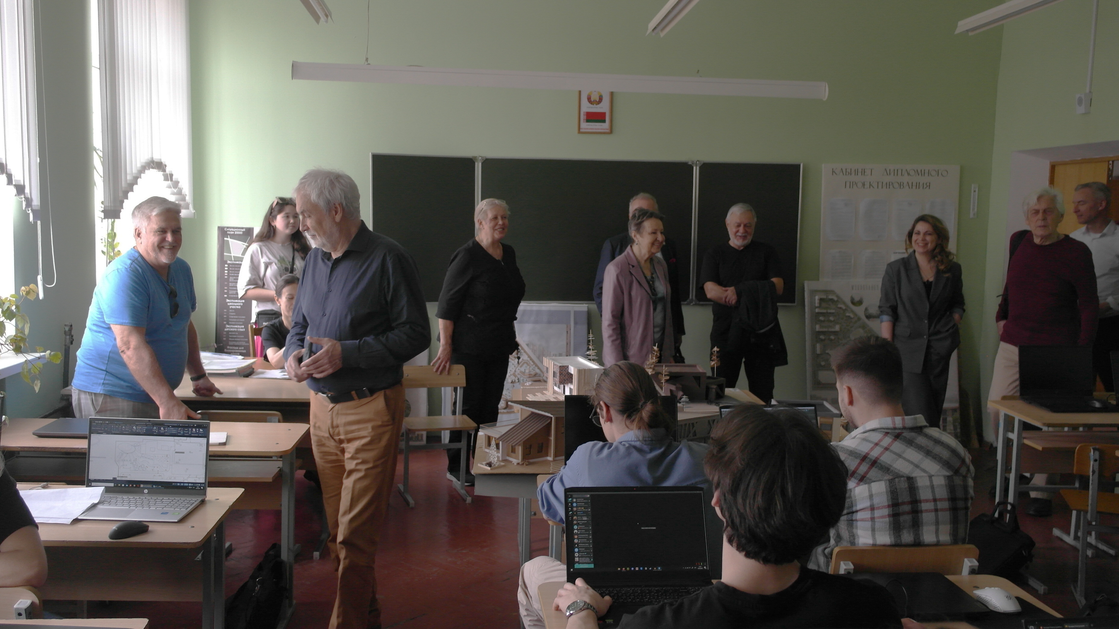 В аудитории за чашкой чая гостям была предложена к просмотру презентация об учебном заведении и предметах, которые наполняют специальность «Архитектура», слайды показали все нюансы подготовки по спецпредметам и многогранность приобретения знаний по профессии. Докладчиком был учащийся 4 курса Кашковский Владислав, который кроме презентации по специальности показал свои исследования в области изучения руинированного памятника костела Девы Марии в деревне Дуброво Молодеченского района Минской области и попросил совета у уважаемых гостей в вопросе дальнейших шагов по сохранению и реконструкции дошедшего до нас архитектурного наследства. Члены правления оказались неравнодушны к судьбе памятника архитектуры и высказали каждый свое мнение по возможному развитию дальнейших событий и усилий молодого исследователя.