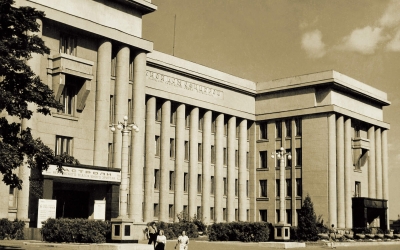 Чуецца голас часу і ў велічнай каланадзе Акадэміі навук, праект будынка якой пачынаў Георгій Лаўроў, а дапрацоўваў Лангбард. Ён быццам прадбачыў далейшае развіццё Мінска і ўзвёў у новым раёне горада збудаванне, якое апярэдзіла час і сваім маштабам належала хутчэй будучаму, чым тагачаснаму.