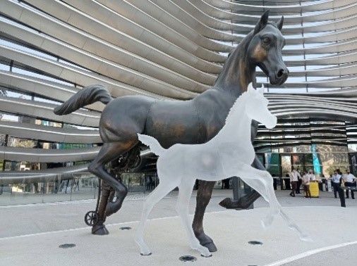 Использование традиционных и новейших материалов продемонстрировали и в павильоне ОАЭ. Так, интерактивная площадка коммуникации представителей разных стран помимо современных средств связи впечатляла использованием традиционной флорентийской мозаики на полу (фото 3), а также полиэфирных смол в скульптурных композиций (фото 4). Тематика скульптуры имеет национальный колорит, отсылая к традиционному для восточных стран культу лошади.
