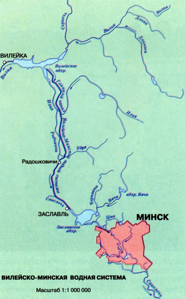В 1970–1976 гг. была построена Вилейско-Минская водная система протяженностью 62 км с пятью насосными станциями, которые обеспечивают подъем воды на 75 м, что позволило перебрасывать около 380 млн м3 воды в год из реки Вилии (бассейн Балтийского моря) в реку Свислочь (бассейн Черного моря) и увеличить проточность Свислочи в 4–5 раз (до 17 м3/сек. летом и 13 м3/сек. зимой).