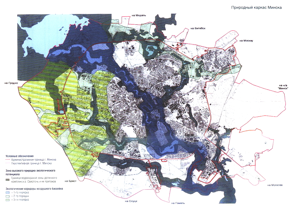 В генеральных планах развития Минска, утвержденных в 2010 и 2016 гг. (рук. А. Акентьев), усилена экологическая направленность формирования природно-ландшафтного комплекса города. В соответствии с экологической моделью разработаны предложения по формированию природного каркаса территории Минска.