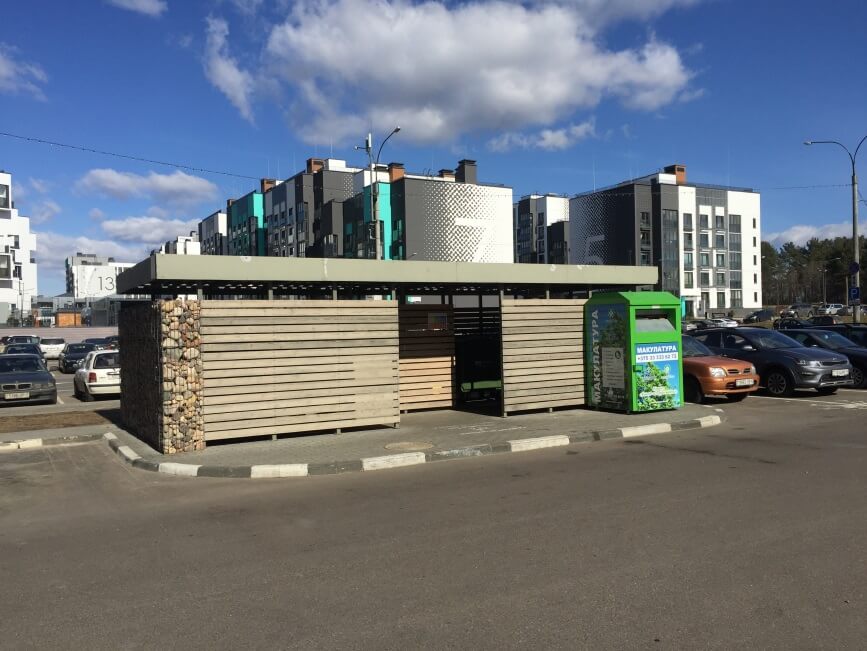 Фото 19. Павильон для раздельного сбора мусора, расположенный рядом с парковкой личных автомобилей жильцов. Жилой район «Новая Боровая» в Минске |