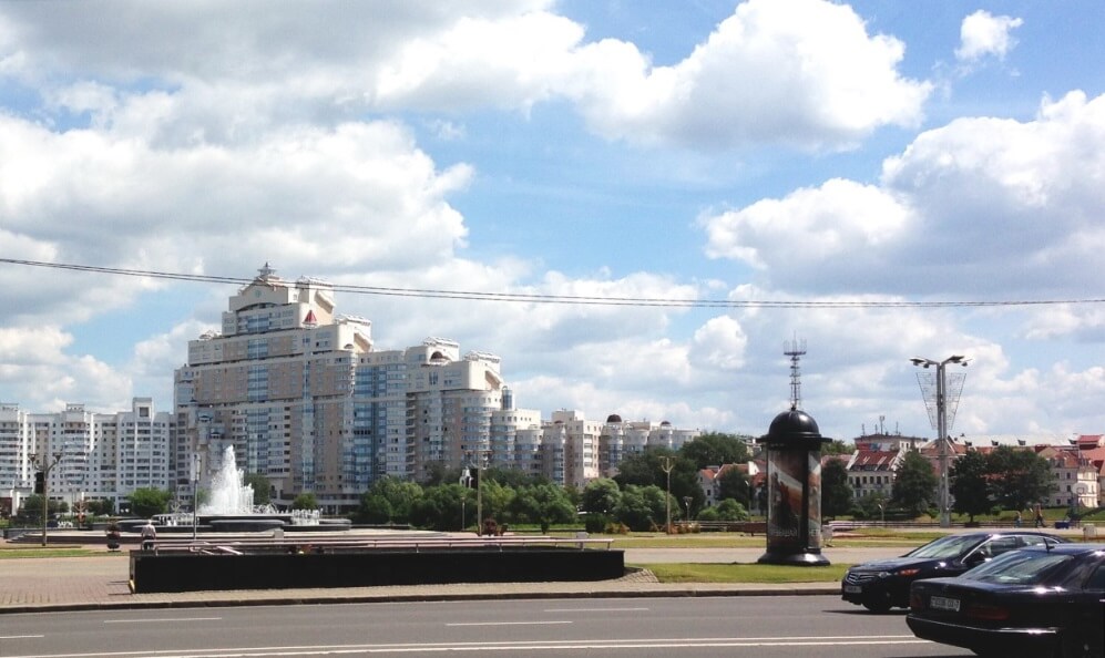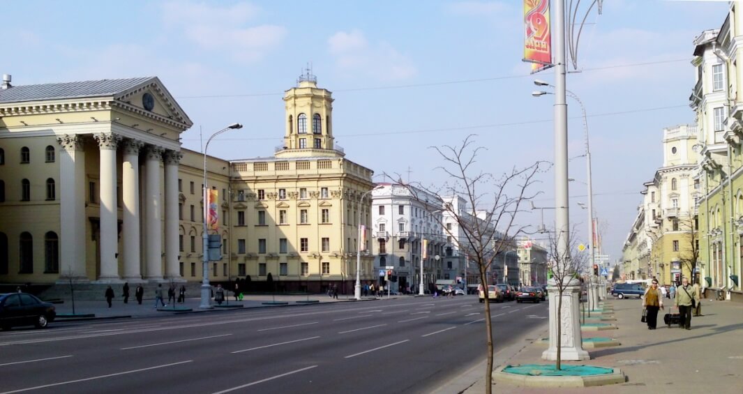 Примером такого градостроительного ансамбля является застройка центральной части пр. Независимости. По результатам проведенного в 1947 г. конкурса для реализации был выбран проект М. Парусникова, разработанный под влиянием классической архитектуры.