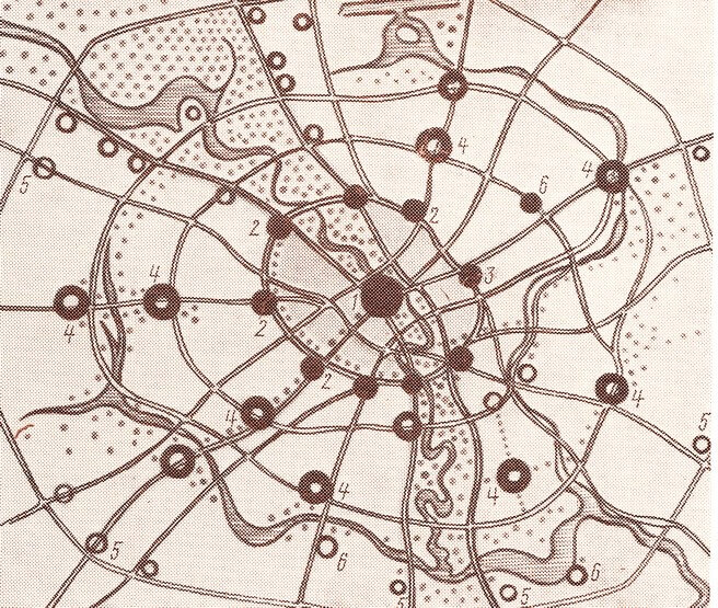 Фото 6. Схема «золотых точек» – мест размещения высотных зданий, ранжированных по композиционной значимости (архит. Л. Потапов). Минск, 1975 г |