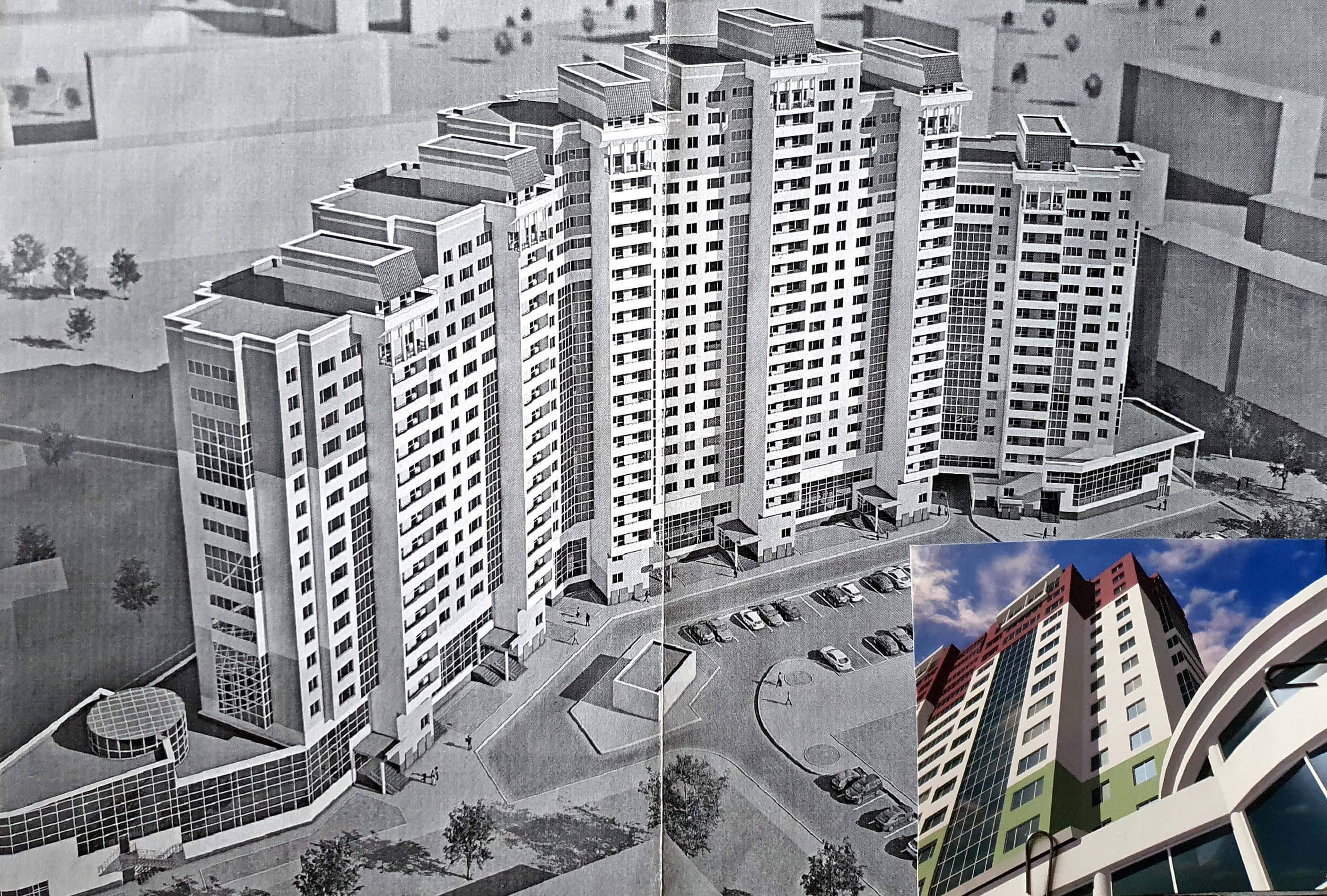 2005-2010 г. 17-23 этажный 390 квартирный жилой комплекс со встроенно-пристроенными помещениями и подземными стоянками по ул. Я. Мавра №32а в г. Минске. Реализация 2015 г. Генпроектирование: ОАО «Институт Минскгражданпроект», 9.