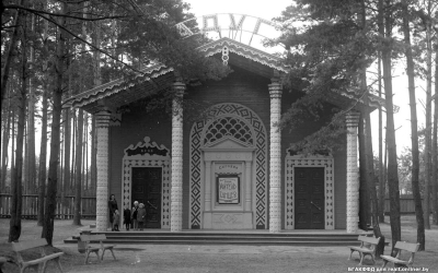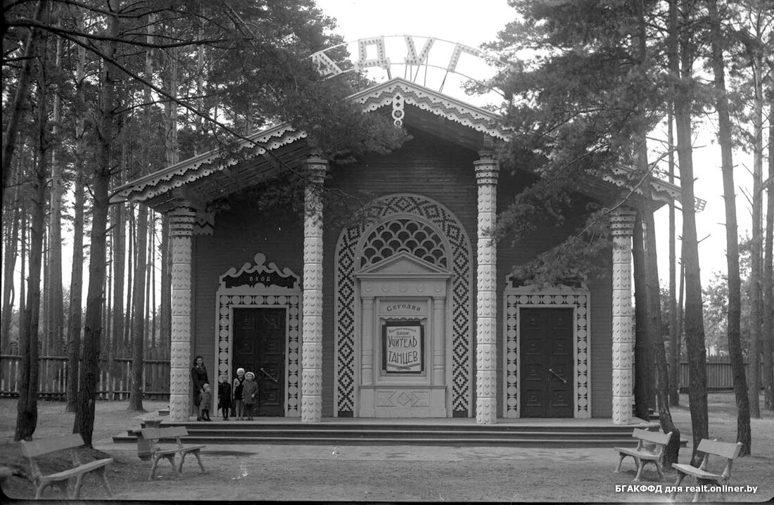 Первой работой Сысоева в белорусской столице стал проект кинотеатра «Радуга», построенного в начале 1950-х в парке Челюскинцев. Этого здания давно не существует, но фото сохранилось. Резная ажурная отделка деревянного фасада напоминает вологодское кружево. Ничего удивительного, учитывая, откуда родом автор. Глядя на снимок, понимаешь, что здание было колоритно.