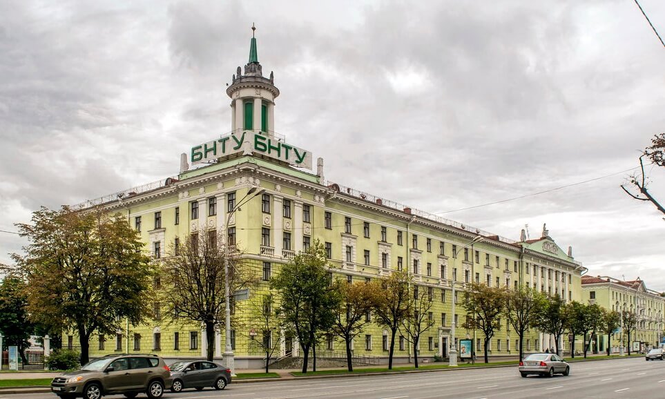 Прогулку продолжаемся вдоль пр.Независимости. Жилой дом возле кинотеатра «Октябрь» (ул. Б. Хмельницкого, 2) также запроектирован Георгием Васильевичем. В Советское время объект был хорошо известен своим кафе «Батлейка», расположенном на 1 этаже. Еще одна работа мастера - общежитие БНТУ на пр. Независимости, 61. Это здание ни с чем не спутаешь, его украшает башенка, она как ориентир и акцент застройки университетского городка. Главный учебный корпус возвели до войны, но при проектировании общежития был сохранен тот же архитектурный стиль. Еще не наступил период борьбы с архитектурными излишествами, потому зодчие могли себе позволить декор на фасадах, колонны, лепнину. Но все же кое-что упростили.
