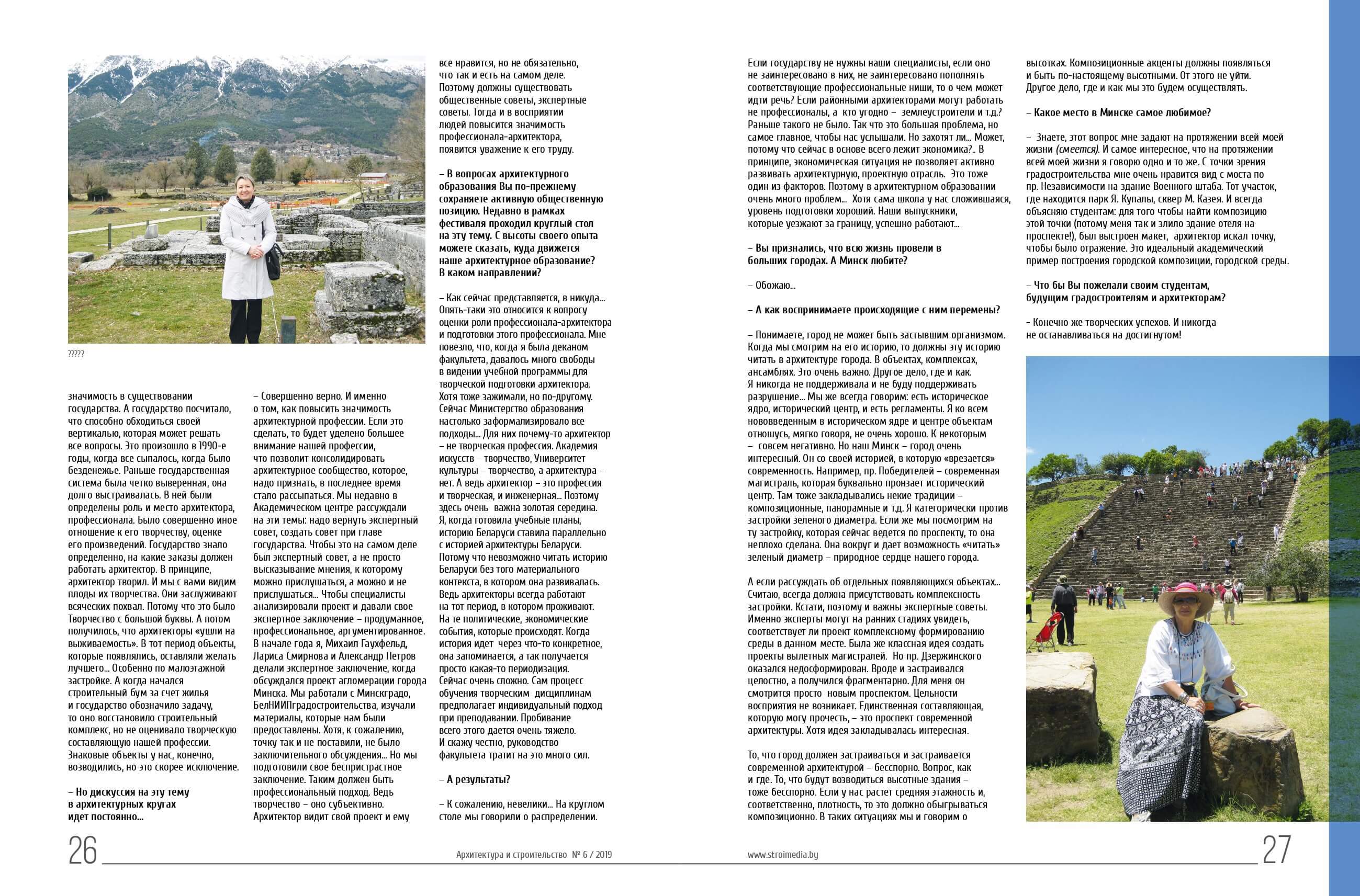 – Совершенно верно. И именно о том, как повысить значимость архитектурной профессии. Если это сделать, то будет уделено большее внимание нашей профессии, что позволит консолидировать архитектурное сообщество, которое, надо признать, в последнее время стало рассыпаться. Мы недавно в Академическом центре рассуждали на эти темы: надо вернуть экспертный совет, создать совет при главе государства. Чтобы это на самом деле был экспертный совет, а не просто высказывание мнения, к которому можно прислушаться, а можно и не прислушаться… Чтобы специалисты анализировали проект и давали свое экспертное заключение – продуманное, профессиональное, аргументированное. В начале года я, Михаил Гаухфельд, Лариса Смирнова и Александр Петров делали экспертное заключение, когда обсуждался проект агломерации города Минска. Мы работали с Минскградо, БелНИИПградостроительства, изучали материалы, которые нам были предоставлены. Хотя, к сожалению, точку так и не поставили, не было заключительного обсуждения… Но мы подготовили свое беспристрастное заключение. Таким должен быть профессиональный подход. Ведь творчество – оно субъективно. Архитектор видит свой проект и ему все нравится, но не обязательно, что так и есть на самом деле. Поэтому должны существовать общественные советы, экспертные советы. Тогда и в восприятии людей повысится значимость профессионала-архитектора, появится уважение к его труду.