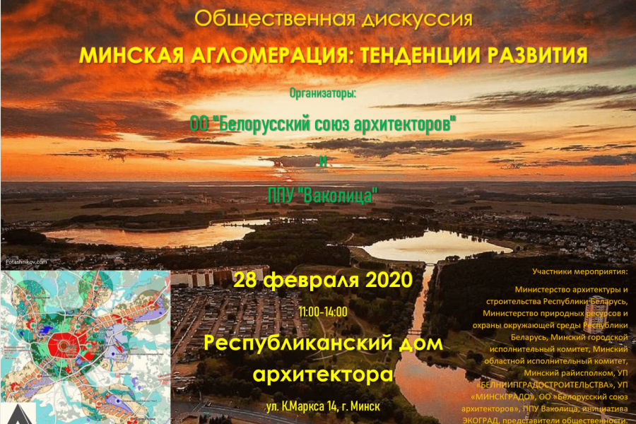 Общественное объединение «Белорусский союз архитекторов» и правозащитно-просветительское учреждение «Ваколица» проводят панельную дискуссию между ключевыми игроками "пристоличной" градостроительной политики - администрациями Минска и Минской области, ведущими проектными институтами, экспертами и представителями заинтересованной общественности при участии профильных министерств о существующих трендах и проблемных вопросах в развитии Минского района и городов-спутников.