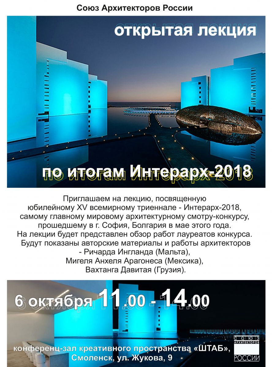 Лекция посвящена юбилейному XV Всемирному Триеннале архитектуры «Интерарх 2018» - самому главному мировому архитектурному смотру-конкурсу, прошедшему в г. София, Болгария в мае этого года. Это важнейшее событие в мировой архитектурной жизни, поскольку собирает в рамках своих мероприятий лучших архитекторов мира. На лекции будет представлен обзор работ лауреатов конкурса. А также будут показаны авторские материалы и работы архитекторов - Ричарда Ингланда (Мальта), Мигеля Анхеля Арагонеса (Мексика) и Вахтанга Давитая (Грузия).