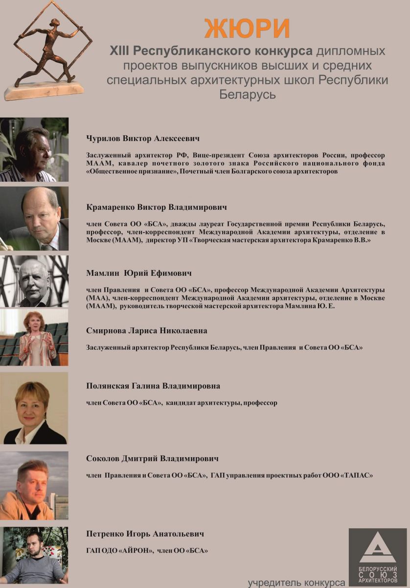 26 сентября 2019г. жюри XIII Республиканского конкурса дипломных проектов выпускников высших и средних специальных архитектурных школ Республики Беларусь в рамках фестиваля «Архитектурная Осень-2019» назовёт ПОБЕДИТЕЛЕЙ. Церемония награждения пройдет в Республиканском Доме архитектора (г. Минск, ул. К. Маркса,14) в 15.00. Познакомьтесь с составом жюри конкурса.