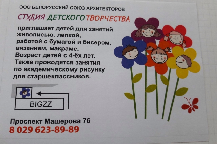 Студия детского творчества при ОО «Белорусский союз архитекторов» приглашает детей для занятий живописью, лепкой, работой с бумагой и бисером, вязанием, макраме. Возраст детей с 4-х лет. Также проводятся занятия по академическому рисунку для старшеклассников.