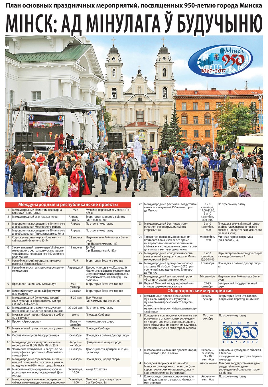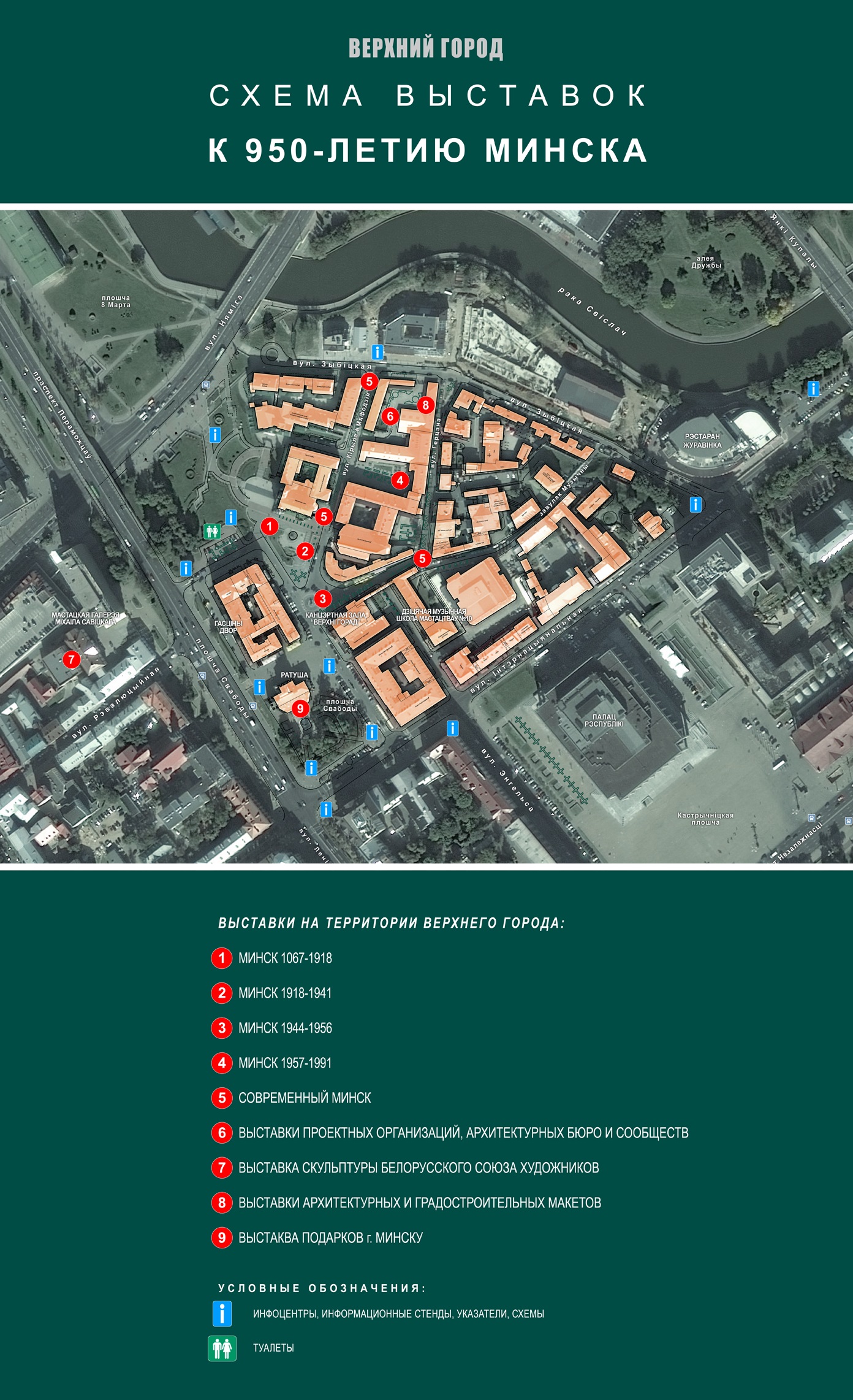 В план включены выставки к 950-летию Минска, которые предполагается разместить, как на открытой территории Верхнего города на строительных лесах, так и в помещениях: Ратуши, музея археологии и др. (планшеты, макеты).