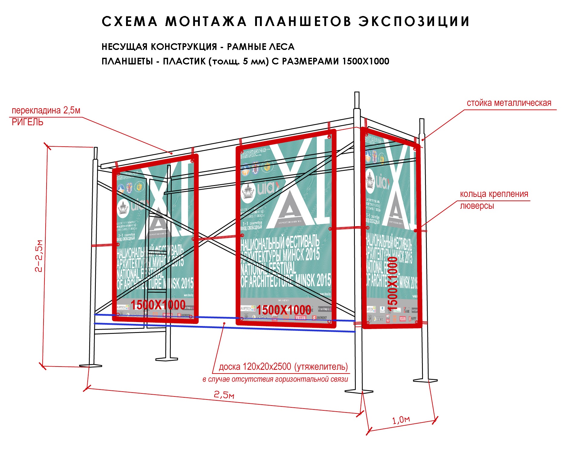 Размер планшетов и размещение на строительных лесах, аналогично выставкам фестиваля архитектуры «Минск-2015г.»